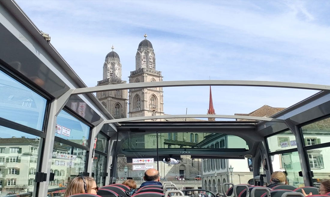 Hop on an Open-top bus for a sightseeing tour with audio guide and uncover the best of Zurich and its iconic highlights!